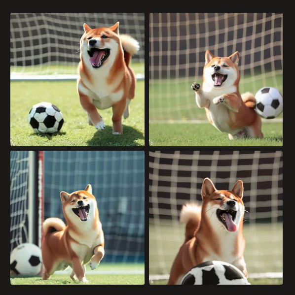ここでは例として、「サッカーの試合でゴールを決めて喜んでいる柴犬」とプロンプトに入力し、画像を作成します。10秒くらい経つと、画像が4枚作成されます!