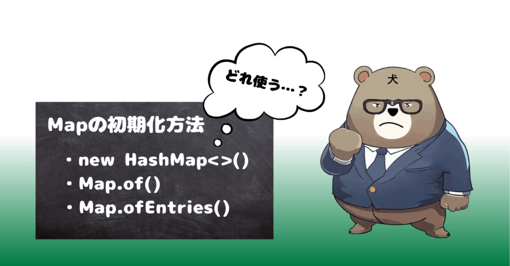 本記事では、JavaでMapを初期化する基本的な方法を紹介しました。Mapを初期化するという観点では、要素を動的に変更する場合はnew HashMap<>()、固定データを安全に扱いたい場合はMap.ofEntries()を選ぶのがベストだと考えます。ユースケースに応じて、選択してください!